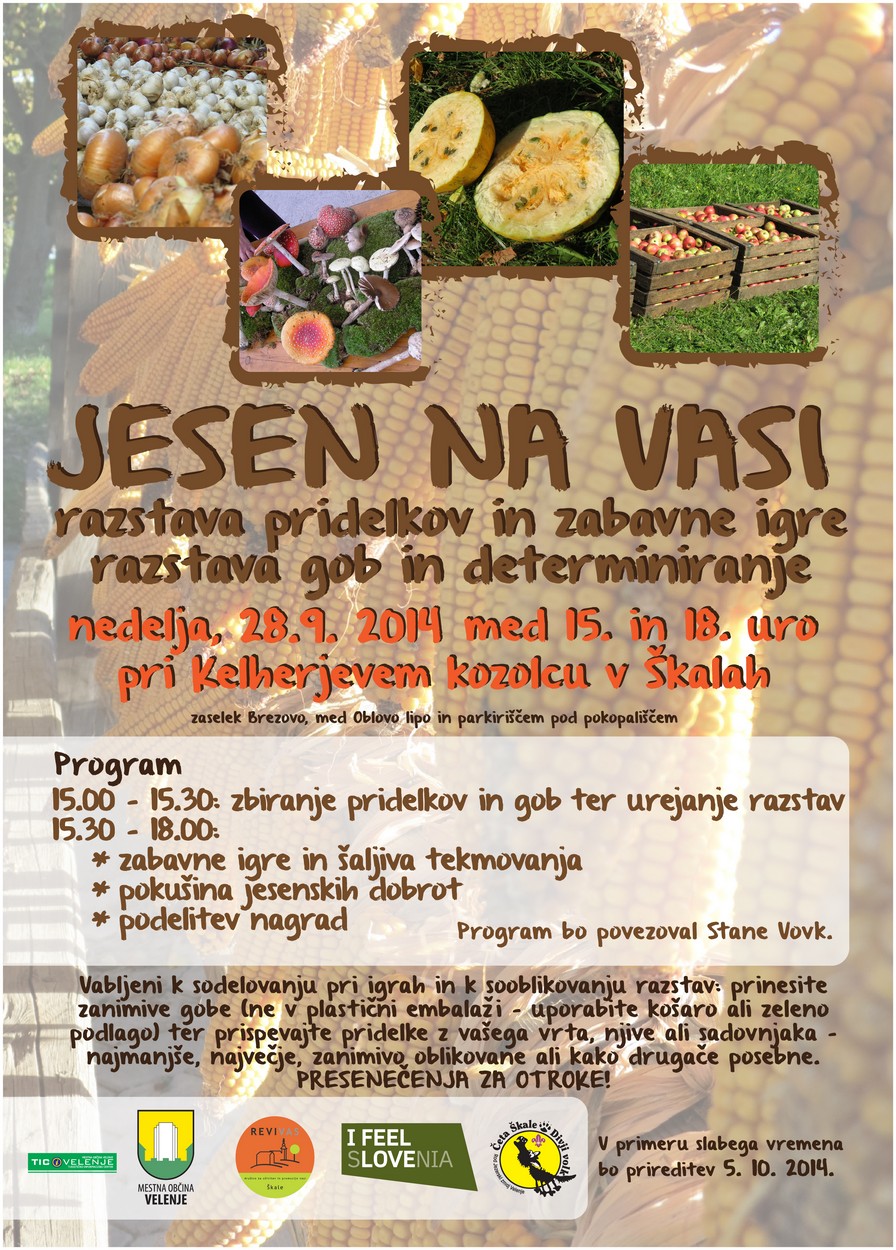 Društvo REVIVAS Škale v sodelovanju s taborniki čete Divji volk Škale organizira v nedeljo, 28. septembra, ob 15. uri pri Kelherjevem kozolcu prireditev JESEN NA VASI. Pripravili bomo zabavne igre za otroke in odrasle, skupaj z obiskovalci pa tudi razstavo pridelkov in razstavo gob. Vabljeni, da prinesete kakšno gobo in o njej povprašate strokovnjaka – determinatorja. Pa seveda pridelke z vašega vrta, njive ali sadovnjaka – da bosta razstavi čim bolj pisani in bogati. Prireditev bo povezoval Stane Vovk. Torej bo zagotovo zelo zanimivo, poskrbeli pa bomo tudi, da ne boste lačni in žejni.