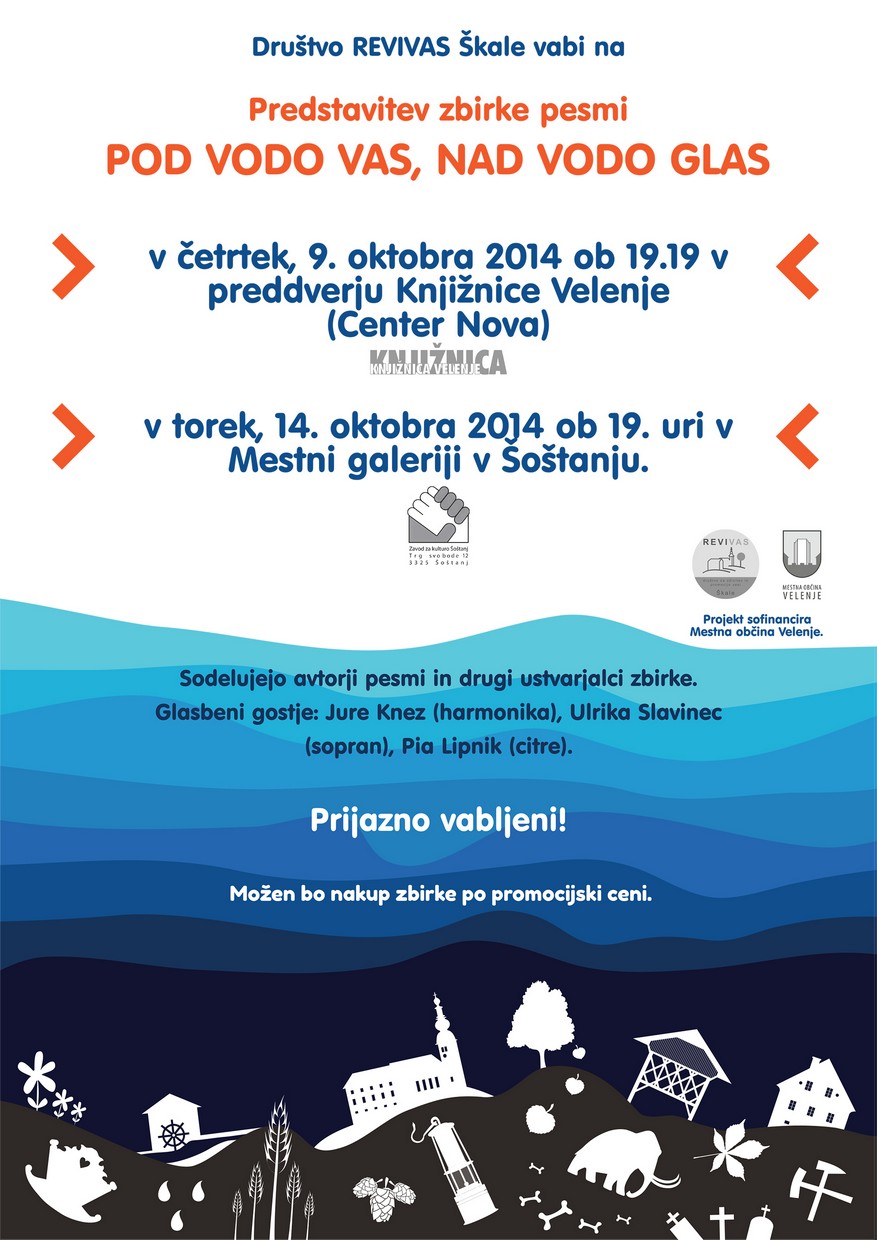 Zbirko POD VODO VAS, NAD VODO GLAS, ki je bila izdana v začetku letošnjega poletja, bomo skupaj z avtorji predstavili širši javnosti v četrtek, 9. oktobra ob 19.19 v Knjižnici Velenje ter v torek, 14. oktobra ob 19. uri v Mestni galeriji v Šoštanju. Program bodo sooblikovali avtorji pesmi in mladi glasbeniki iz naše krajevne skupnosti. Obetata se dva prijetna večera, za katera si je vredno vzeti čas! Prijazno vabljeni!
