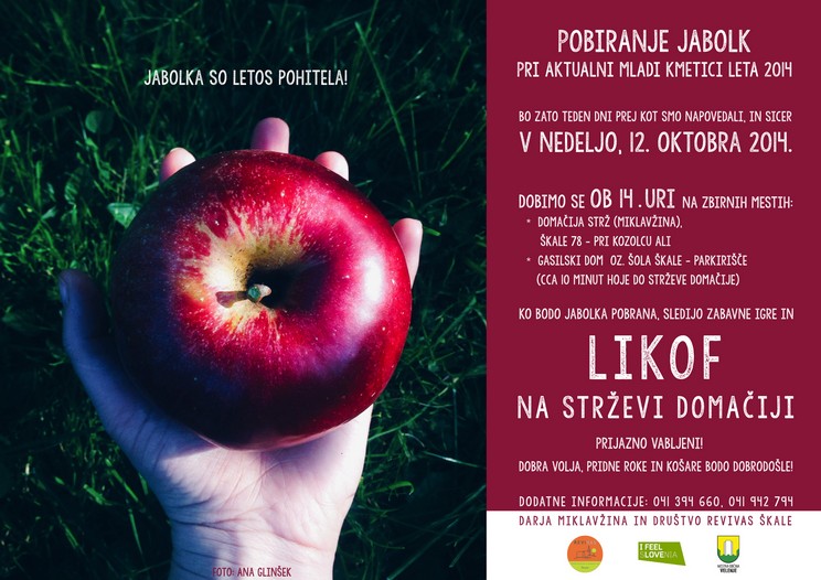 Skupaj z Darjo Miklavžina, mlado kmetico leta 2014, vas vabimo na delovno druženje na Strževo domačijo – to nedeljo, 12. 10. 2014. Dobimo se ob 14. uri na parkirišču pri šoli oz. gasilskem domu in odidemo peš čez Lazišče do kozolca pri Stržu (cca 10 minut hoje). Lahko se nam pridružite tudi kar tam. Gumijaste rokavice in nekaj veder za pobiranje jabolk bo pripravljenih, dobrodošla pa bo še kakšna košara. Če nas bo veliko in bo jabolk zmanjkalo, bomo pri Stržu delali še kaj drugega – dokler si ne zaslužimo poštenega golaža! Poskrbeli bomo tudi za malo zabave, igre in kakšno nagrado.