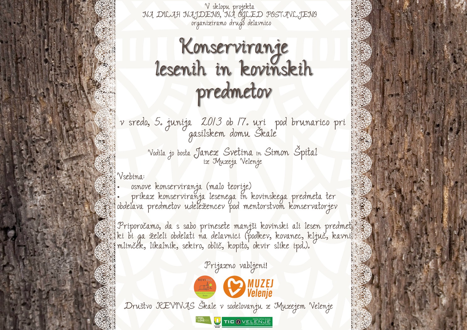 Kot napovedano v vabilu na prvo delavnico, ki smo jo uspešno izvedli 22. maja 2013, bo v sklopu projekta NA DILAH NAJDENO, NA OGLED POSTAVLJENO organizirana še ena delavnica – tokrat na temo KONSERVIRANJE LESENIH IN KOVINSKIH PREDMETOV. Potekala bo v sredo, 5. junija 2013 od 17. do predvidoma 19. ure pod brunarico pri gasilskem domu Škale. Vodila jo bosta Janez Svetina in Simon Špital iz Muzeja Velenje.