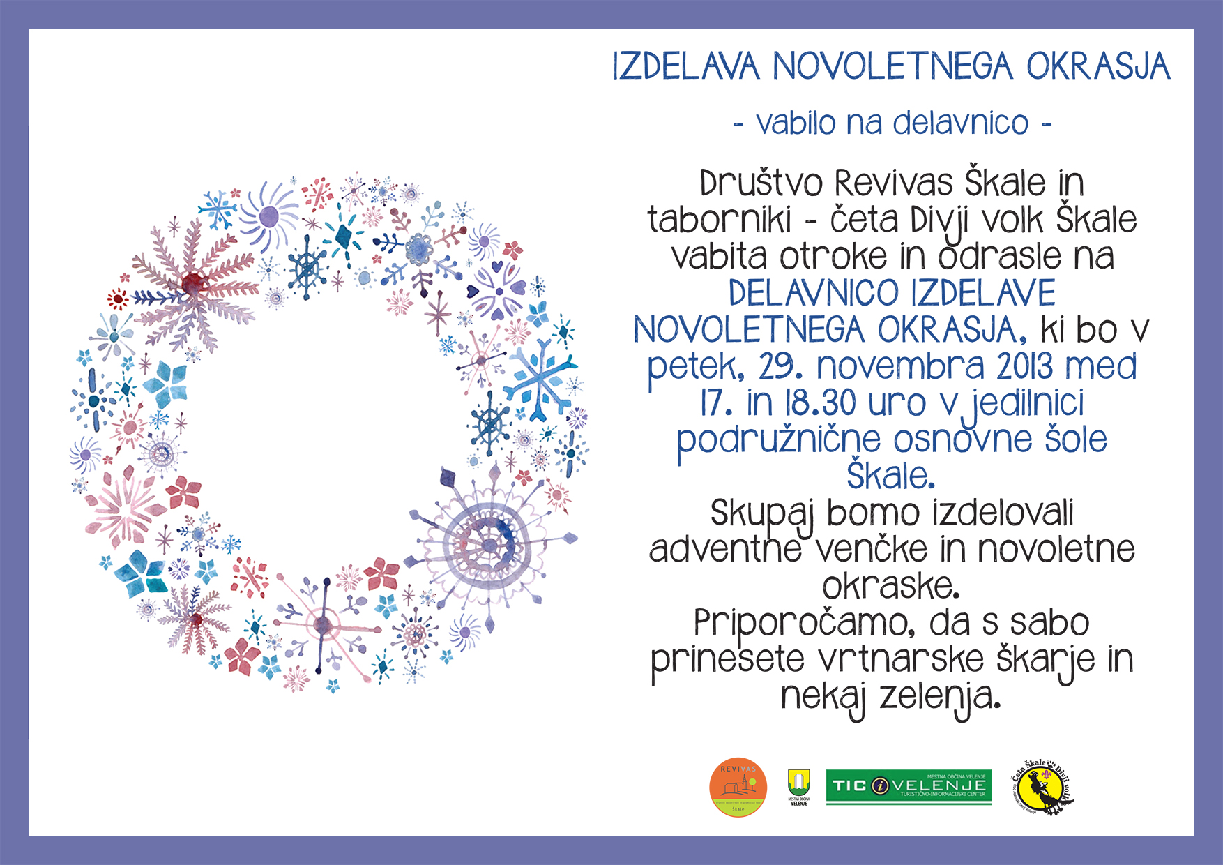 Društvo REVIVAS Škale in taborniki – četa Divji volk Škale tudi letos vabita otroke in odrasle na DELAVNICO IZDELAVE NOVOLETNEGA OKRASJA, ki bo v petek, 29. novembra 2013 med 17. in 18.30 v jedilnici podružnične osnovne šole Škale. Skupaj bomo izdelovali adventne venčke in novoletne okraske. Za adventne venčke prinesite s sabo nekaj zelenja in vrtnarske škarje.