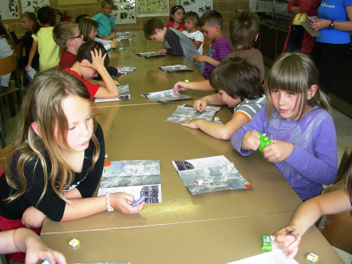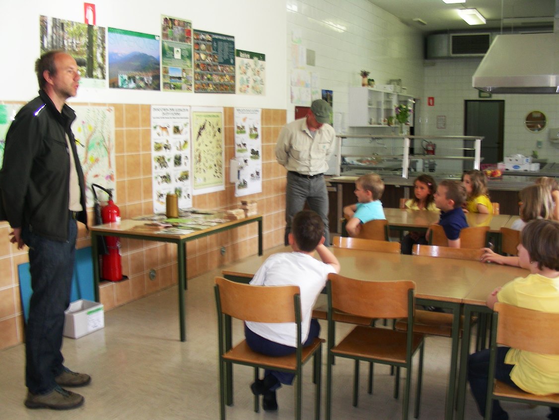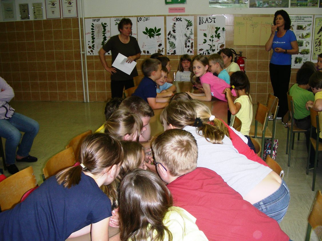 Na šoli Škale smo v torek, 21. 5. 2013, organizirali srečanje in delavnice z gozdarjem. Ob tednu gozdov, ki je vsako leto v zadnjem tednu maja, sta otroke obiskala Aleš Ocvirk in John Vugrinec z Zavoda za gozdove Slovenije, Krajevne enote Šoštanj. V prvem delu sta s pomočjo plakatov predstavila delo gozdarjev, vedenje ljudi v gozdu, pomen gozda in lesa, ptice in druge živali, ... V drugem delu so se otroci razdeli v skupine in z njima odšli v gozd. Tam so podrobno spoznali posamezne drevesne vrste, podrast, uživali v ptičjem petju in svežem zraku. Nabrali so liste, plodove, podrast in veje in ob vrnitvi v šolo s tem materialom ustvarjali v delavnicah. Iz odtisov lubja so nastala nova drevesa, nekateri so odtiskovali liste v nove zanimive oblike, drugi so pripravili razstavo vsega nabranega. Na koncu so se v skupinah pomerili v kvizu, vse ekipe so znale odgovoriti na vsa vprašanja. Predsednica društva Revivas Vera Pogačar jih je nagradila s sladkim presenečenjem. Razstava v jedilnici šole bo odprta do 24. 5. in vse vabimo na njen ogled.
