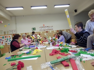 V četrtek, 27. marca 2014 smo organizirali delavnico izdelave rož iz krep papirja. Eden od namenov delavnice je bil evidentirati izdelovalke za vpis v register žive kulturne dediščine. Odziva smo bili veseli, saj so se nam pridružile Milena Blažič, Hedvika Cerkovnik, Angela Jan, Lojzka Ocepek in Marija Pušnik ter še nekatere mojstrice, ki so na začetku sicer potožile, da so "iz vaje", a že po nekaj minutah so lahko tudi one ostalim prisotnim, med katerimi je bilo tudi precej začetnic, pomagale in delile nasvete. Poskusili smo narediti nekaj enostavnejših rožic iz bogatega nabora predstavljenih. Vsi skupaj pa smo se potem lotili še izdelave nageljčkov in v slabih treh urah je nastalo lepo število izdelkov.