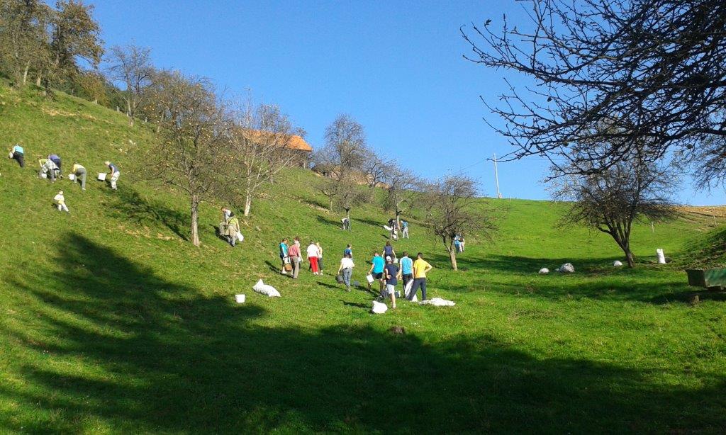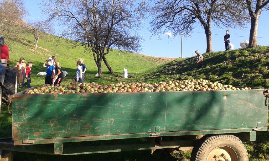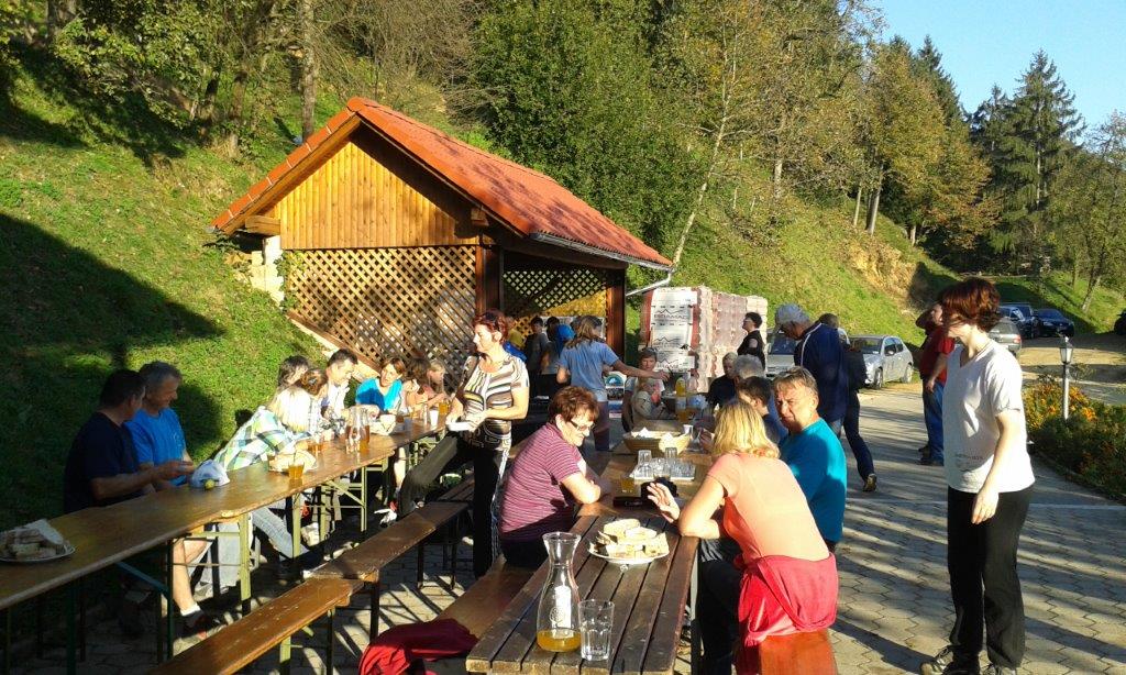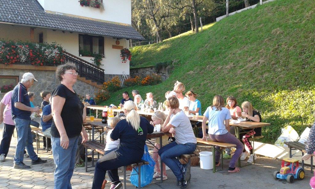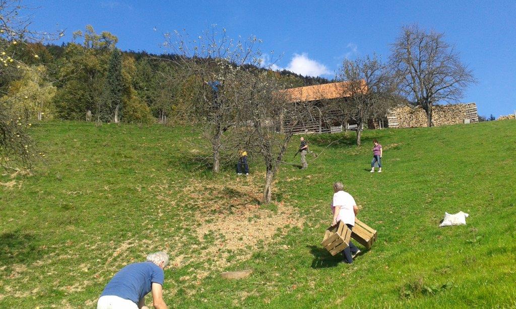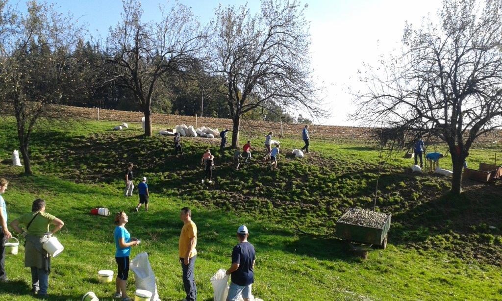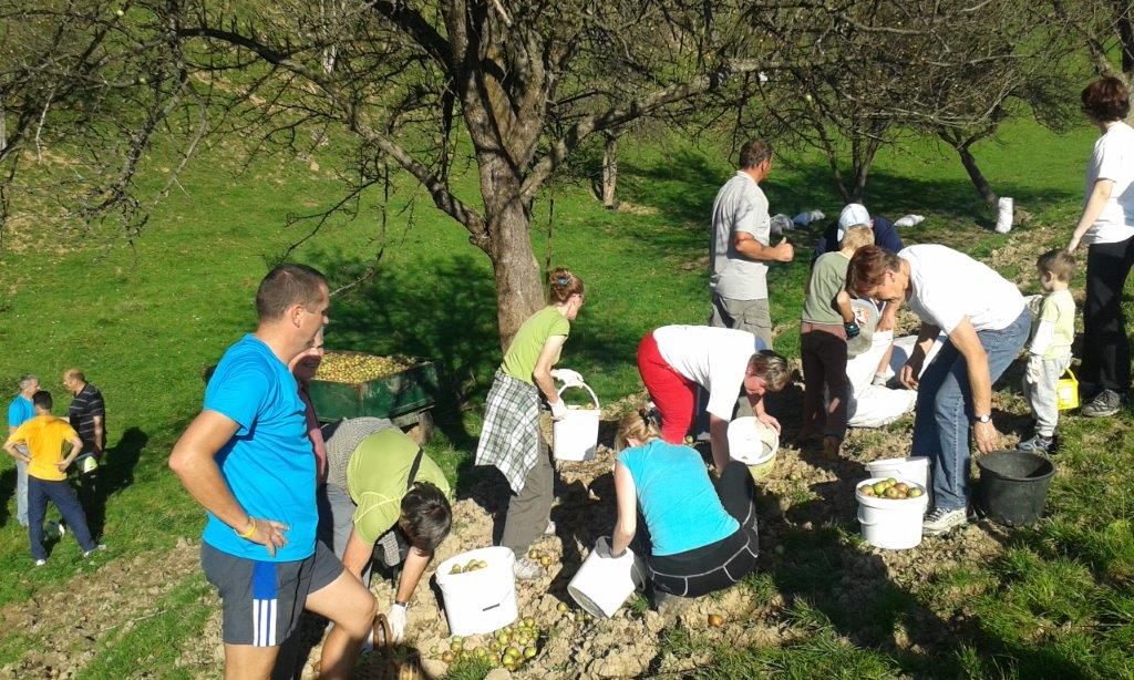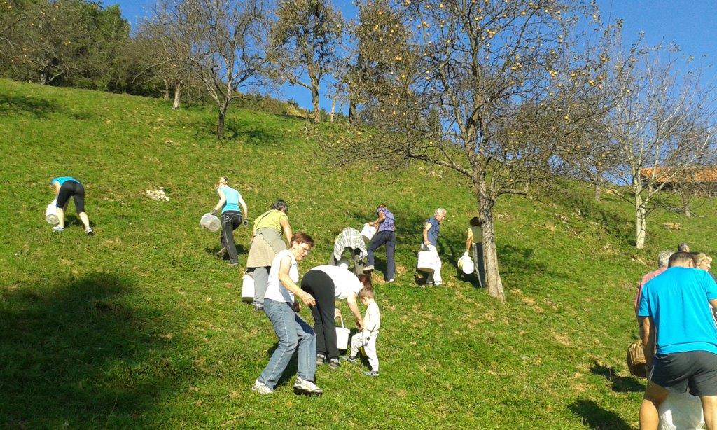 Pri 150 let starem Strževem kozolcu nas je pričakala nasmejana Darja Miklavžina, mlada kmetica leta 2014, s svojo družino. Po uvodnem pozdravu in okrepčilu so nas Strževi razdelili po skupinah – tri za pobiranje sadja in ena za luščenje fižola. Debeli dve uri je potekalo delo, večinoma v precej strmih sadovnjakih. Tu je še posebej prav prišla pomoč številčno in tudi fizično najmočnejših udeležencev, planincev PD Škale-Hrastovec, vajenih takšnih terenov, predvsem pa vedno dobre volje in pripravljenih poprijeti za delo.