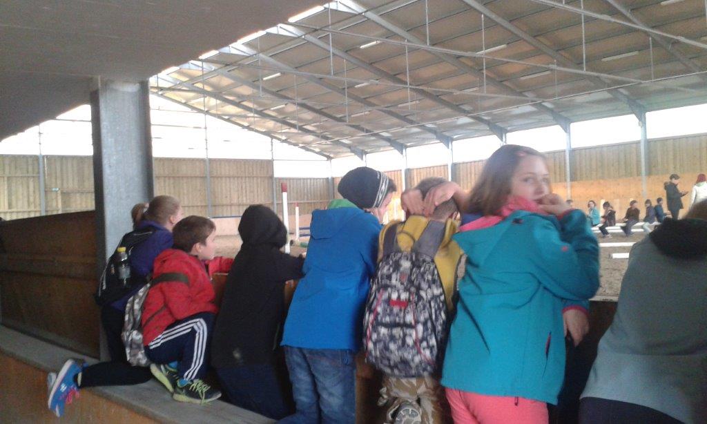 Pri konjereji so nas ljubeznivo sprejela štiri dekleta, ki so nas razdelila v skupine, nato pa izmenično popeljala na ogled štal in na spoznavanje s ponijem. Povedala so nam veliko zanimivosti o negi in vzreji konj ter seveda o tem, kako opremiti konja in sebe ter kako zlesti na konjev hrbet in na njem obstati. Poni Bači je potrpežljivo dovolil vsakemu, da je to tudi v praksi preskusil. Nekateri so vmesni čas izkoristili tudi za rezanje »duhcev« iz majhnih bučk. Preden smo se poslovili, pa je vseh 17 otrok v spomin na prvi letošnji izlet in obisk Konjereje Skaza prejelo pravo podkev - za srečo!
