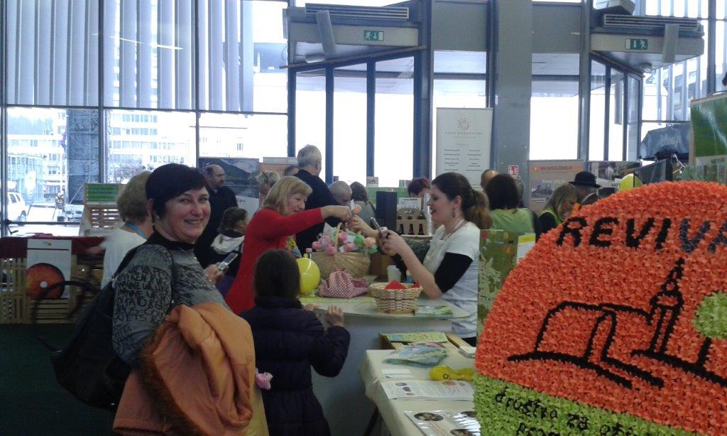Poglede obiskovalcev sta pritegnila še znak društva REVIVAS ter grb Mestne občine Velenje, izdelana iz drobnih rožic iz krep papirja. Članic sekcije izdelovalk rož letos sicer ni bilo na stojnici, marsikdo pa se jih je spomnil od lani in si zaželel svojo rožico. Kar nekaj smo jih razdelili, pa tudi predstavitvenih zgibank sekcije.