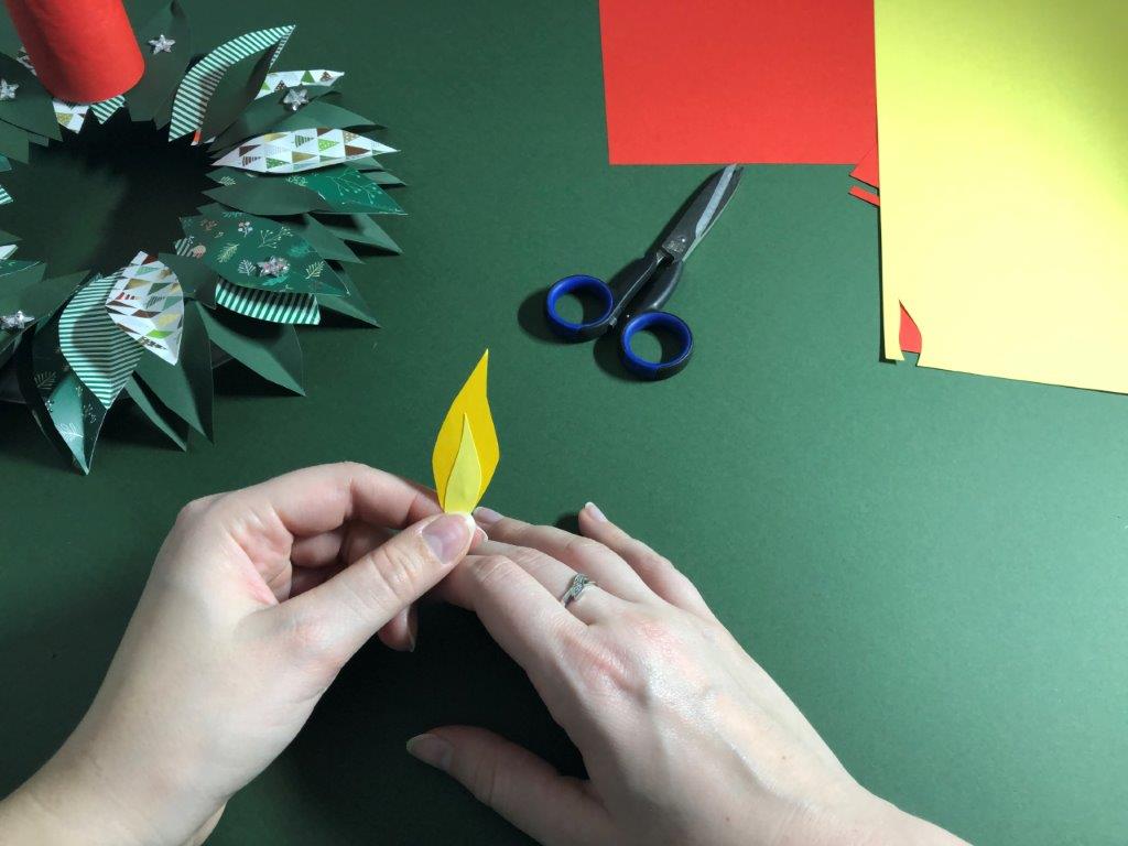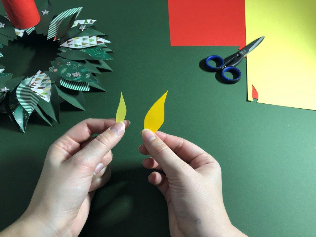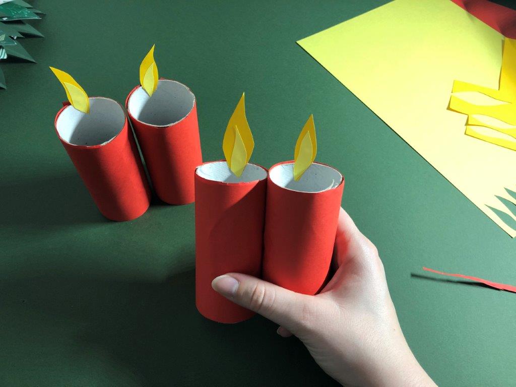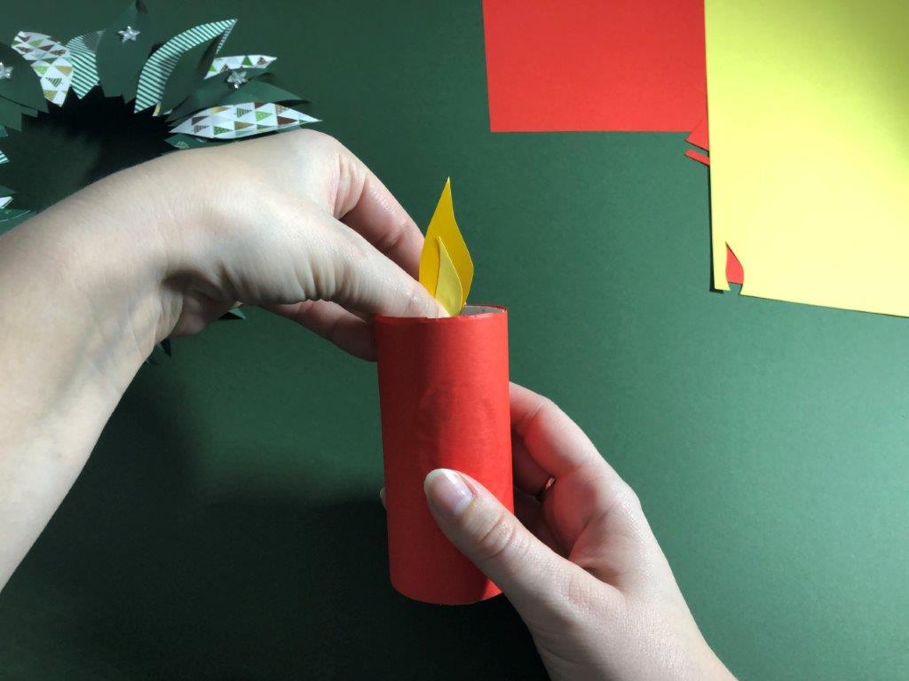 Ker je naš venček narejen iz papirja in na njega ni varno postavljati pravih sveč, si lahko adventne sveče izdelamo kar iz praznih rolic toaletnega papirja. Rolice zavijemo v barvni papir in jim iz kolaž papirja naredimo plamenčke, ki jih prilepimo v notranji rob. Adventni venček je končan!