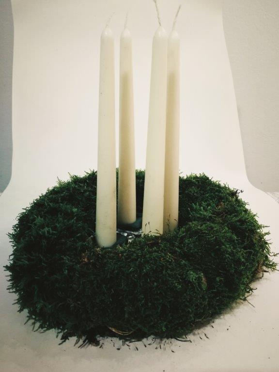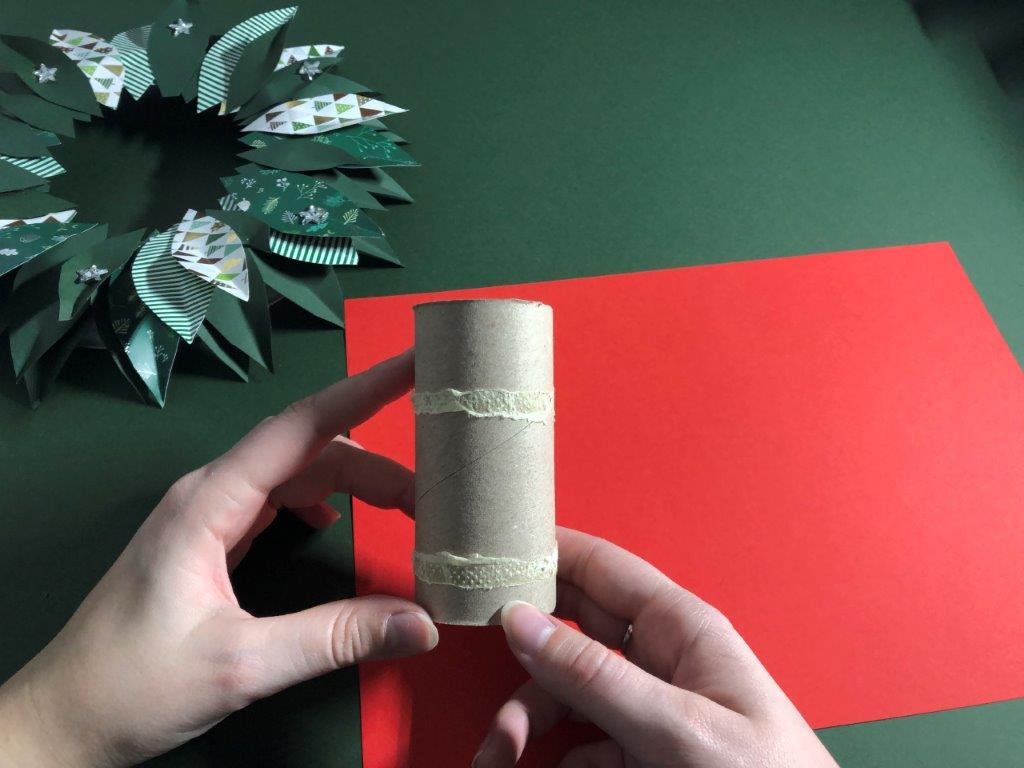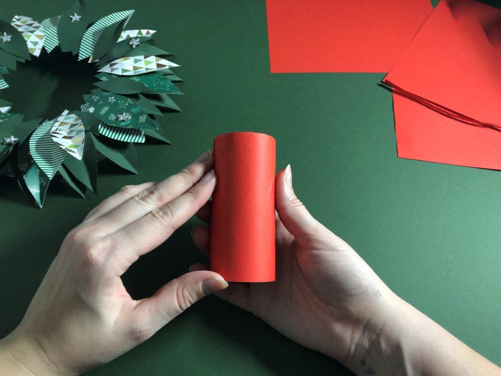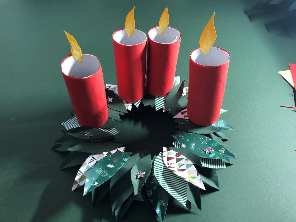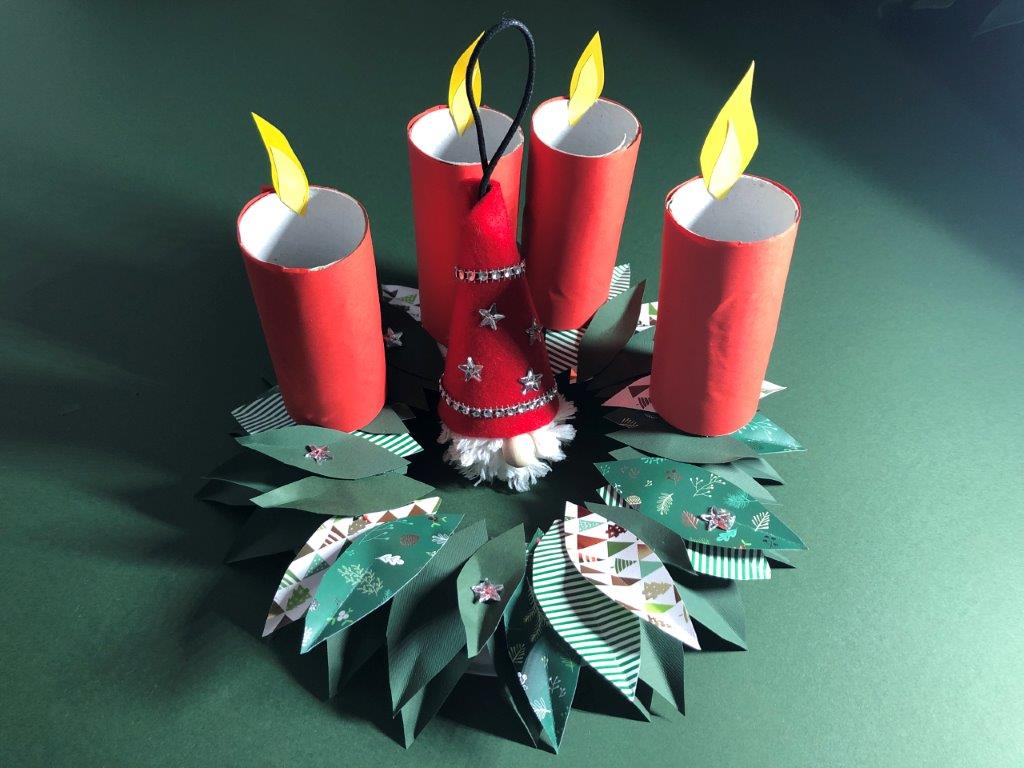 Ker je naš venček narejen iz papirja in na njega ni varno postavljati pravih sveč, si lahko adventne sveče izdelamo kar iz praznih rolic toaletnega papirja. Rolice zavijemo v barvni papir in jim iz kolaž papirja naredimo plamenčke, ki jih prilepimo v notranji rob. Adventni venček je končan!