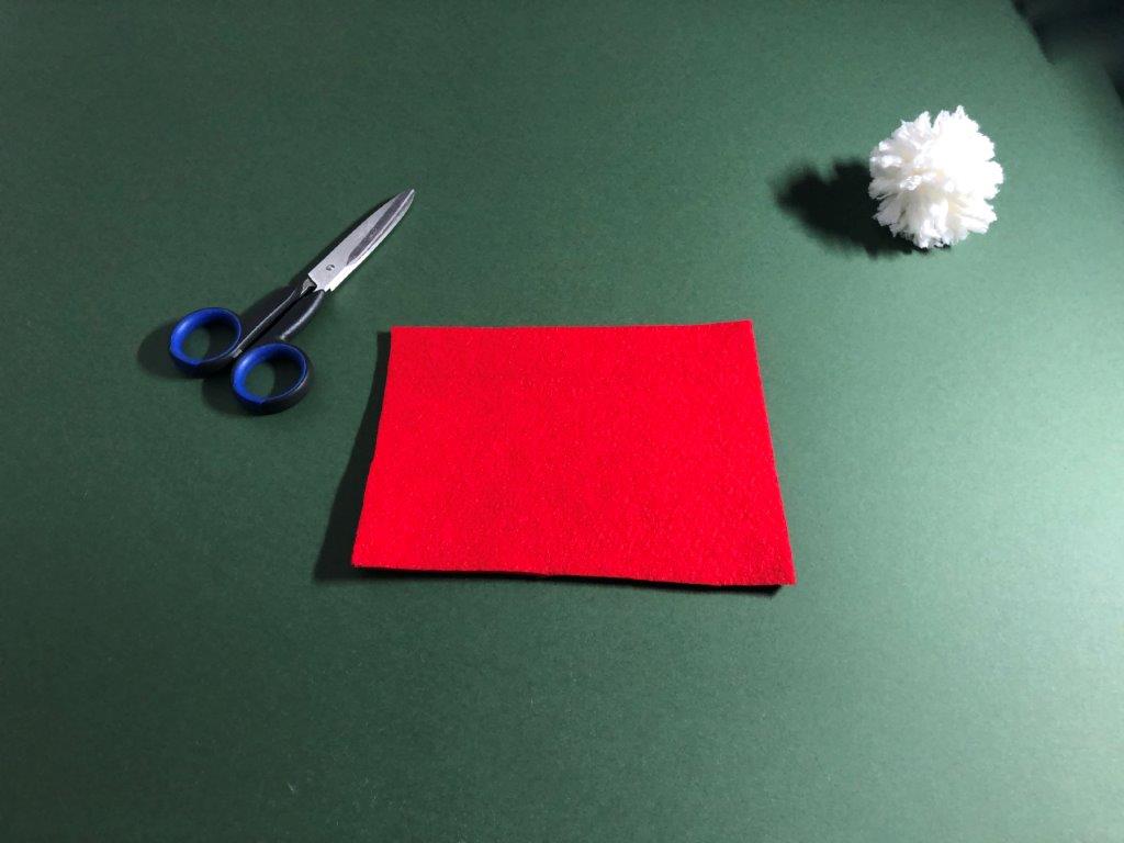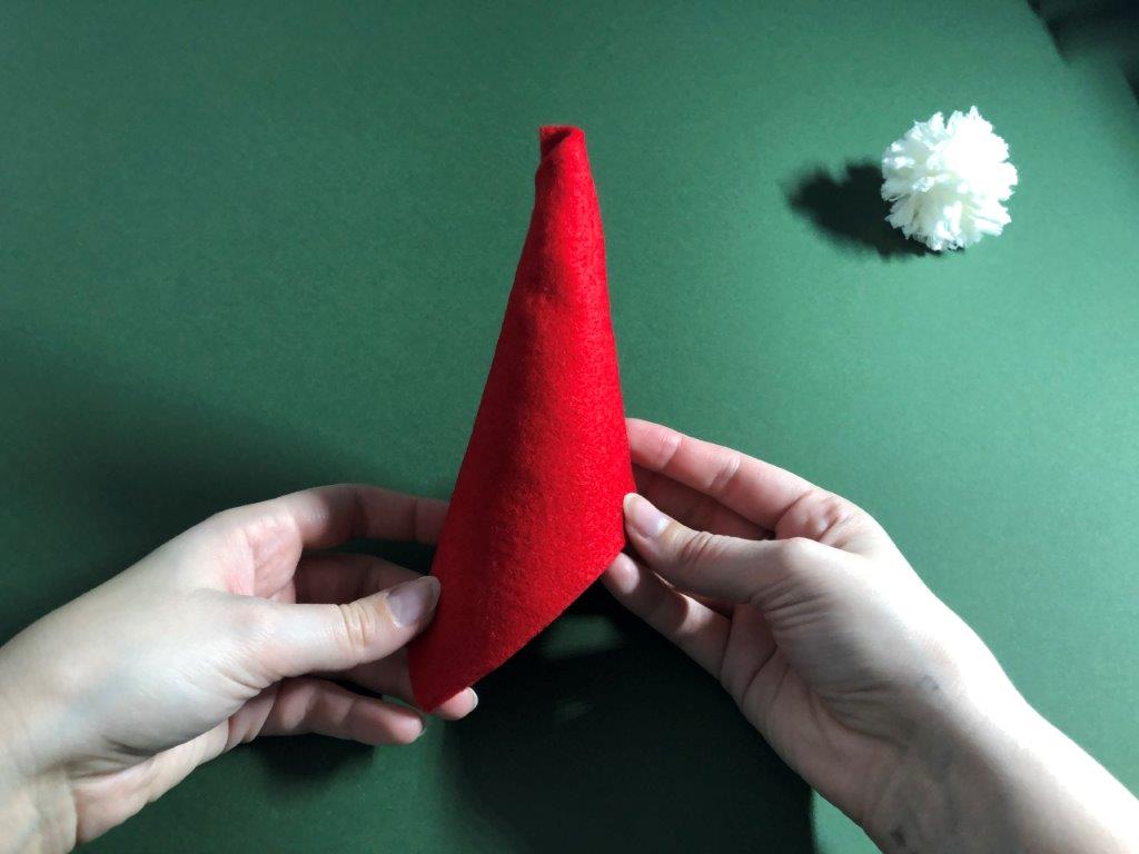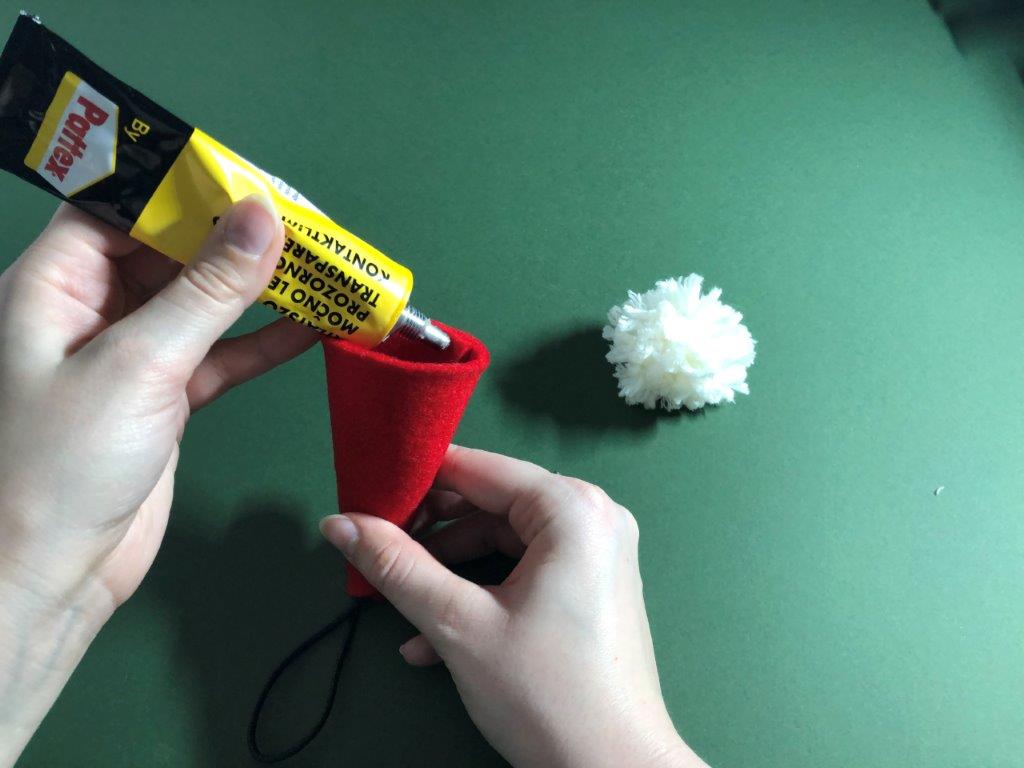 Nadaljujemo s škratovsko kapo. Iz filca odrežemo pravokotnik, pribl. velikosti 12 × 17 cm. Zavijemo ga v stožec in pazimo, da na vrhu ostane luknjica. Rob zalepimo z lepilom. Kapici odrežemo odvečen filc. Iz vrvice ali volne naredimo zanko, ki jo na koncu zavežemo in potegnemo skozi luknjico. Vrvico zavarujemo na mestu z lepilom. Po notranji strani kapice nanesemo lepilo in jo prilepimo na cofek.