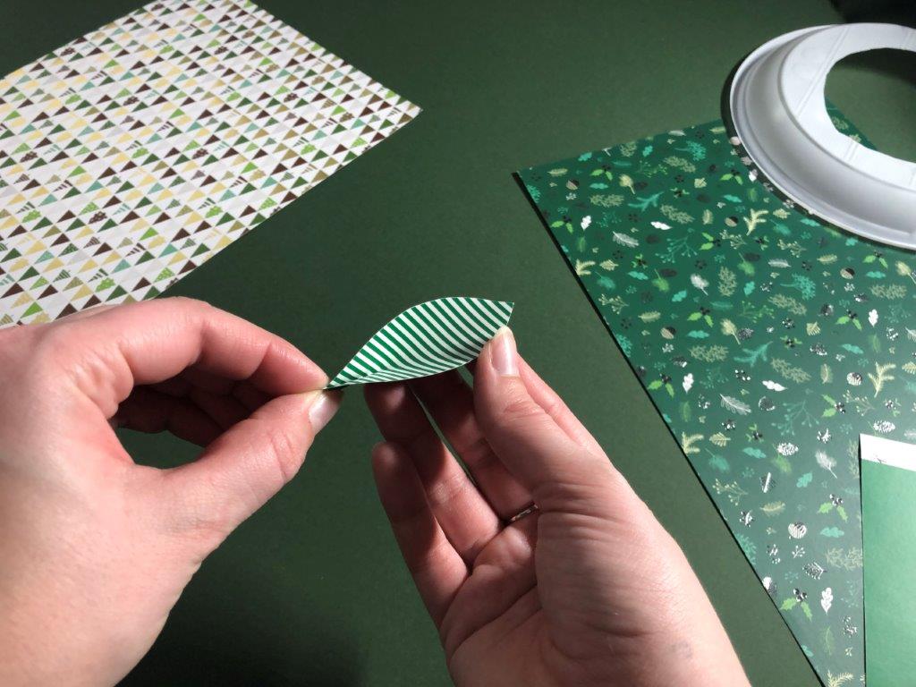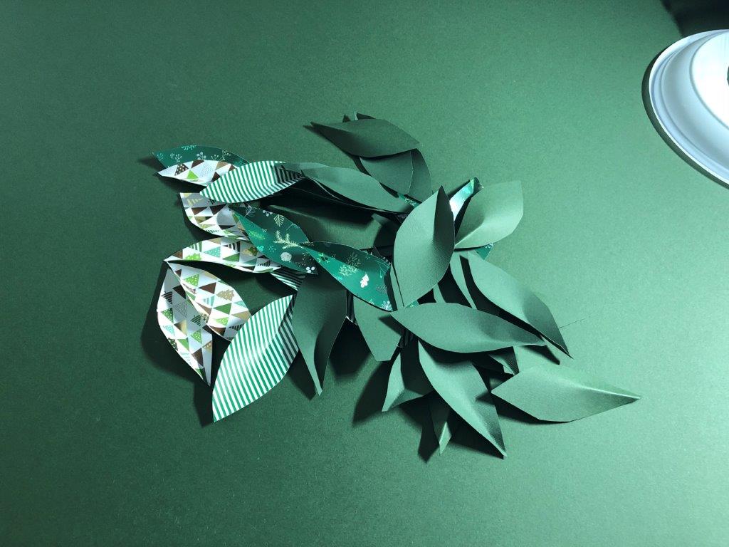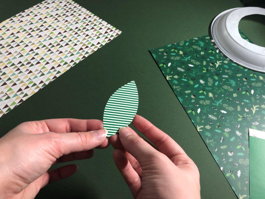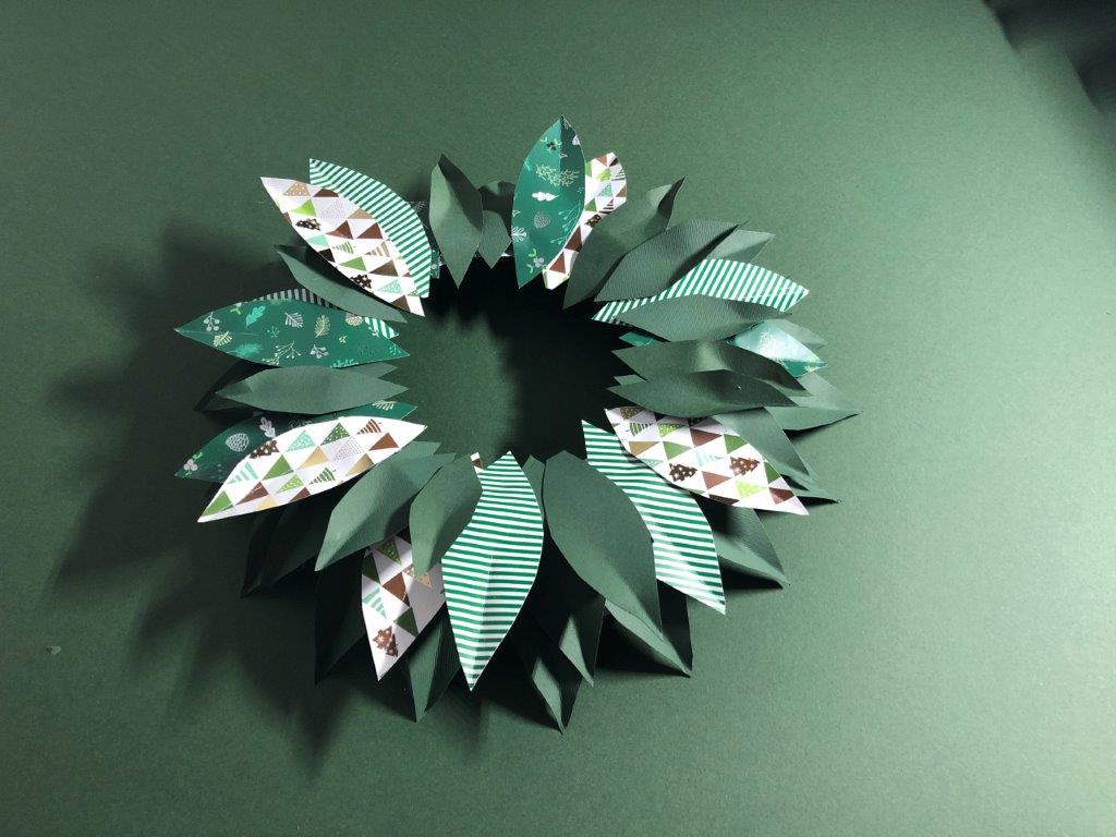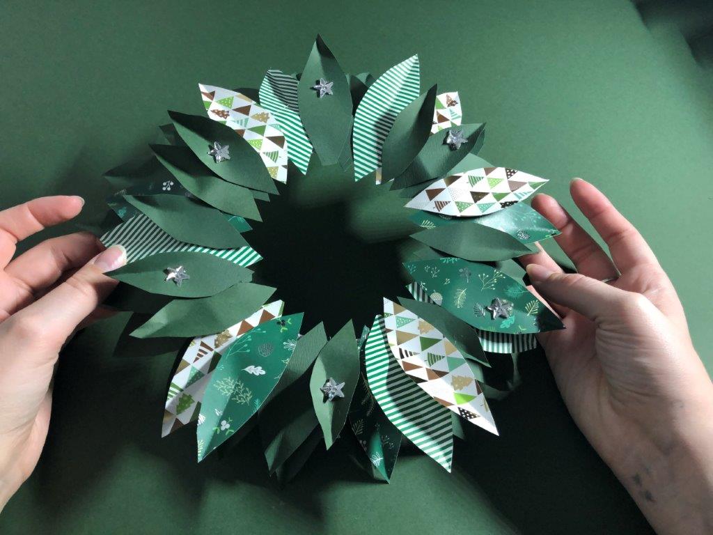Za osnovo adventnega venčka uporabimo papirnat ali plastičen krožnik, v katerega izrežemo luknjo. Iz raznobarvnega papirja (kolaž, revije, časopisni papir,…) izrežemo listje, ki ga na eni strani prepognemo do polovice. Na narobe obrnjen krožnik v pasovih prilepimo listje. Če smo izrezali velike liste, v prvem pasu listom porežemo konice, ki štrlijo proti sredini krožnika. Ko pokrijemo celoten krožnik, venčku dodamo še okraske po želji (bleščice, rožice, storžke …)