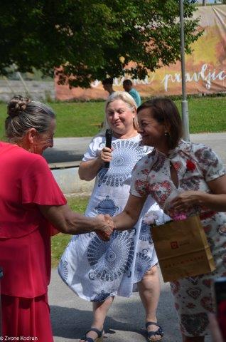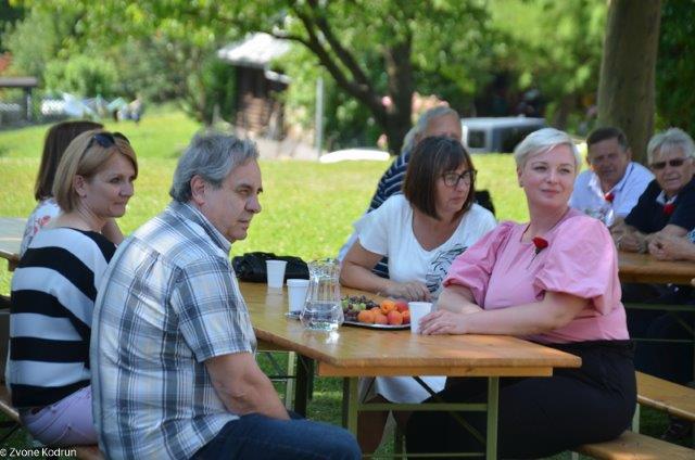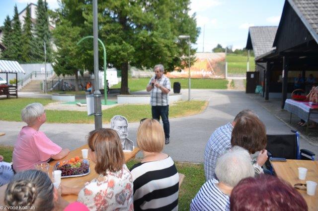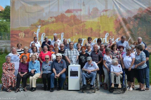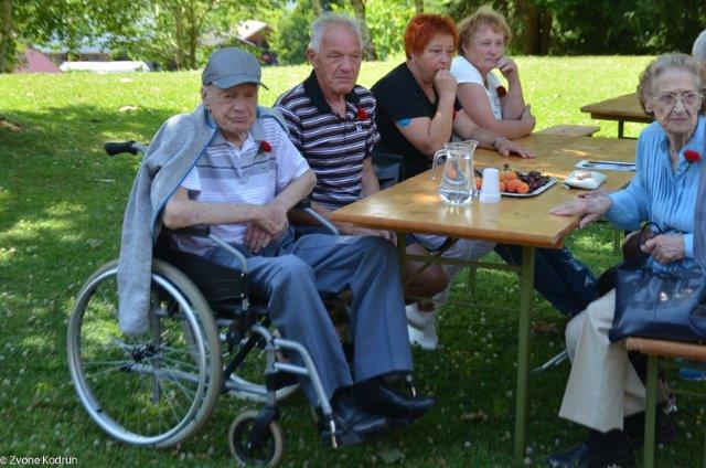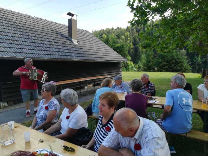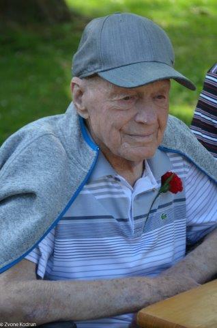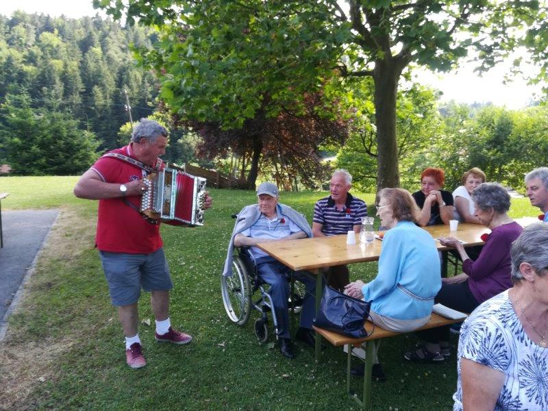 Veseli smo bili, da se je srečanja preseljenih Škalčanov udeležil Bert Tašler, preseljeni Škalčan in tudi naš član, ki je ravno na ta dan praznoval svoj 101. rojstni dan. Ko mu je Finin Jožek izrekel voščilo in raztegnil svoj meh, je pritegnila vsa zbrana družba.