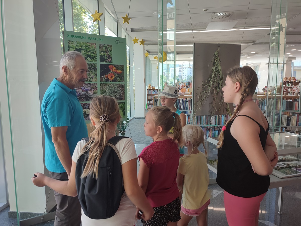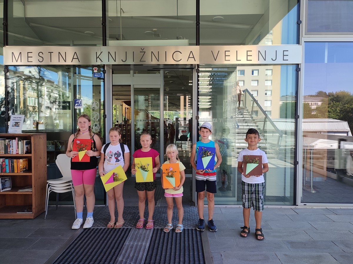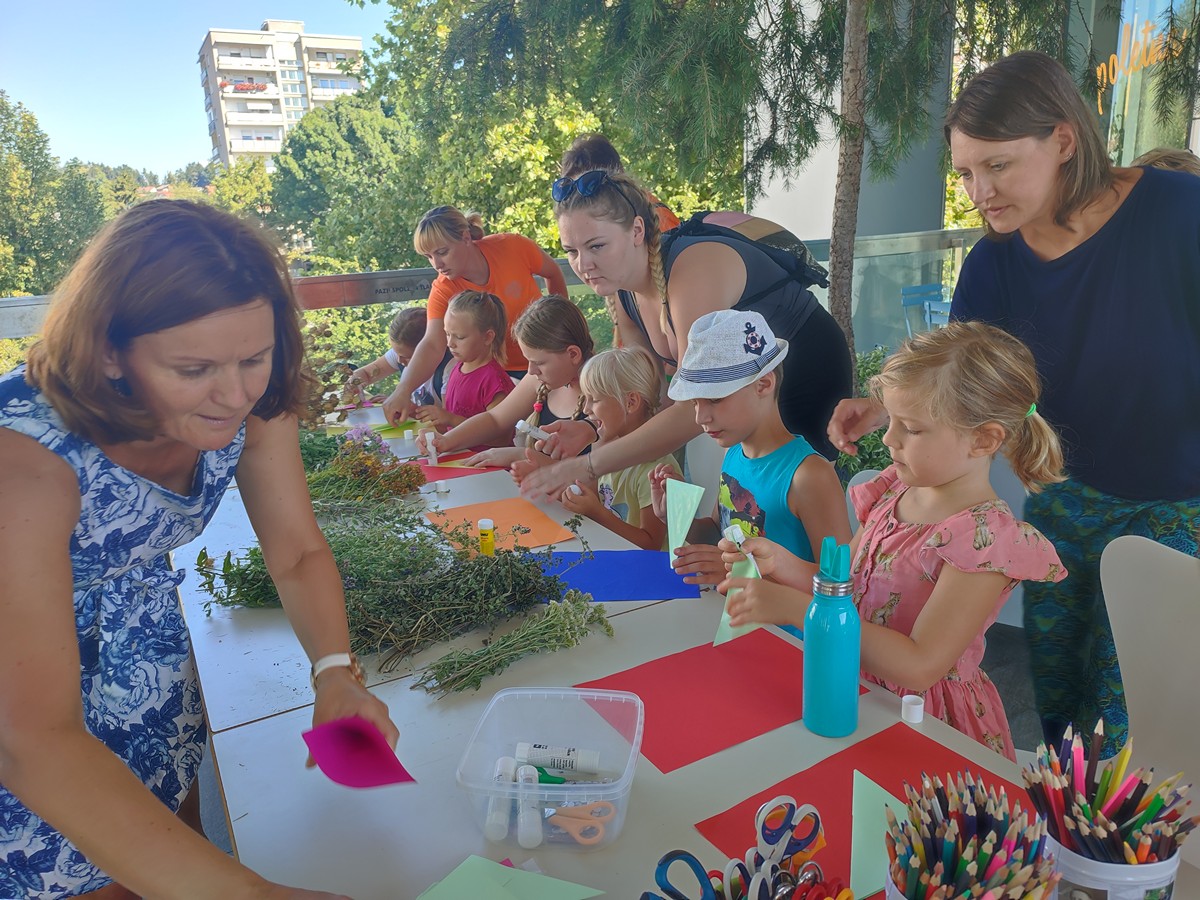 Tudi za naslednje srečanje, 3. 8., smo izkoristili možnost brezplačne vožnje z lokalcem iz Škal do Velenja in nazaj. Zeliščarije, ki jih je vodila Vera Pogačar ob pomoči Saše Miklavžina, Anke Hrašan in Marte Mravljak, so bile prvenstveno namenjene obisku Knjižnice Velenje ter ogledu razstave o zeliščih in sodelovanju na delavnici Društva zeliščarjev Velenje, »Naredimo si poletni šopek«. Bilo pa je še dovolj časa za skok do Titovega trga, obisk stojnice kmetije Eko Mlinar na tržnici in preizkus igral na Pikinem igrišču, nato pa še za igre pri brunarici.
