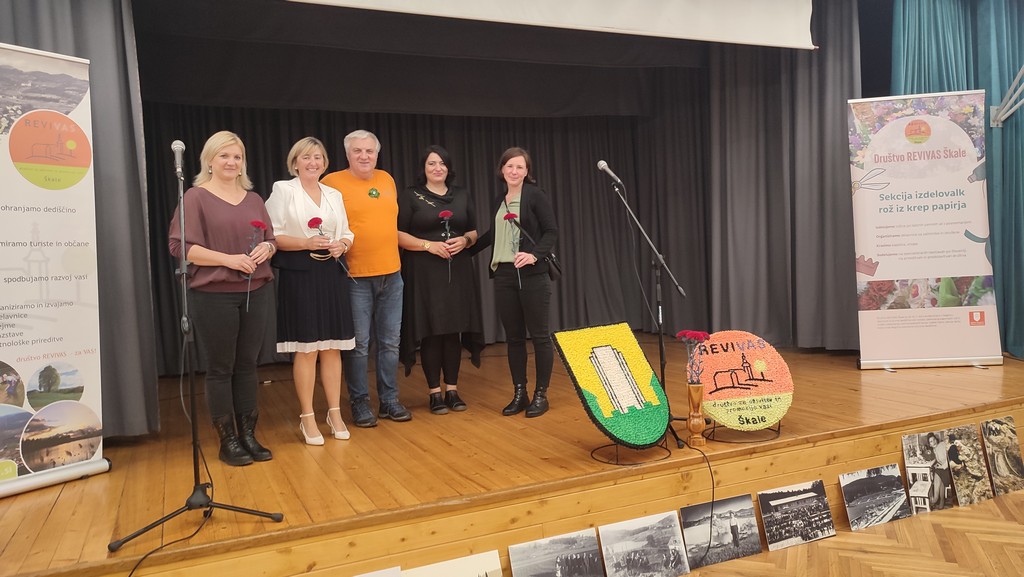 Letos mineva 10 let, odkar je društvo REVIVAS Škale vpisano v register nesnovne kulturne dediščine kot nosilec izdelovanja papirnatih rož in nosilec izdelovanja cvetnonedeljskih butar (snopov). Sekcija izdelovalk rož iz krep papirja je v tem letu intenzivno promovirala svojo dejavnost preko delavnic in predstavitev na tematskih razstavah in različnih dogodkih v občini in izven nje. Z razstavo rož iz krep papirja v domačem kraju pod naslovom ROŽICE ZA 10 pa je, skupaj z društvi, ki redno organizirajo takšne razstave, obeležila 10. obletnico dela. V dvorani KS v gasilskem domu Škale so se poleg naših članic sekcije izdelovalk rož iz krep papirja s svojimi izdelki predstavile še Vranske rož'ce, Turistično društvo Breza Pragersko-Gaj, Turistično društvo Tuhinjska dolina, Turistično društvo Dobrna ter Društvo podeželskih žena občine Žalec. Dvorana je bila skoraj premajhna za vse rožice, ki so jih izdelale njihove pridne in spretne roke. Cvetje vseh barv in oblik je žarelo in privabljalo poglede vseh prisotnih. Razstavo si je ogledal tudi Peter Dermol, župan Mestne občine Velenje.
