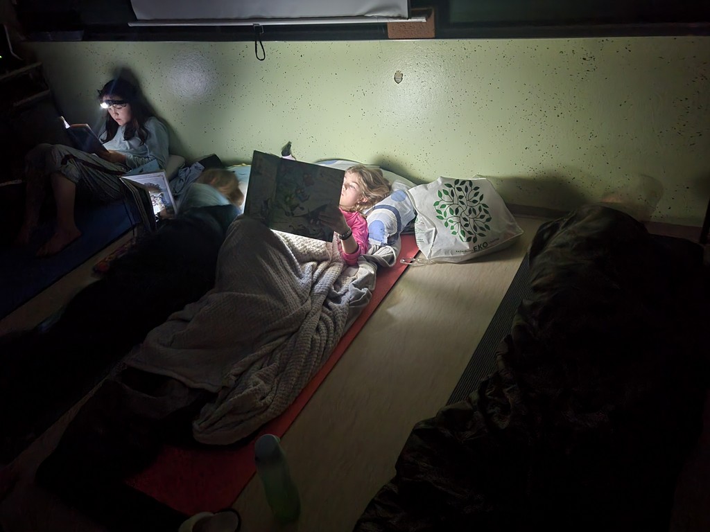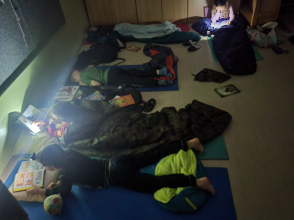 V kuhinji je ta čas nastajala večerja. Učiteljice Eva Kumer, Suzana Fece in Bernarda Srebre ter predsednik Revivasa Zvone Kodrun in kuhar Rozina (Tadej) so za detektive tradicionalno pripravili šmorn in jabolčni kompot. Po okrepčilu pa nas je čakalo celonočno branje. V dveh učilnicah so si otroci od 2. do 4. razreda pripravili prijetne kotičke in s pomočjo naglavnih svetilk začeli z branjem. Nekateri so že kar kmalu utonili v sanje, spet drugi so brali dolgo v noč.